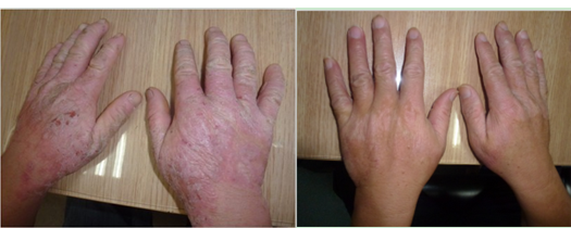 王先生,宁波人,54岁,在家以前以养殖业为主,患有湿疹近8年,严重时,双手部皮肤起小丘疹水泡,后来发展成渗液、干燥、结痂、粗糙肥厚与裂口,并伴着钻心的痒,搔得血迹斑斑,特别夜里瘙痒得难以入睡。白天又不能好好的干活,年年治疗,好了又复发,一直不能根治。
