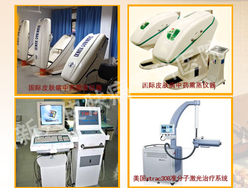 根据国内卓越、专业领先的目标定位,以及中西医结合的特色,本院率先购置国际一流、国内尖端的诊疗设备及器械。如:中药熏蒸仪器(太空舱式)、德国进口 DM 毛囊检测仪、美国准分子高能紫外光治疗仪、高能量超脉冲二氧化碳激光、Q开关翠绿宝石激光、韩国Mirror专业皮肤分析系统等设备,建立了牛 皮癣紫外线光疗室、红外线及纳米波治疗室、中药熏蒸治疗室、中药石膏倒模治疗室、医学美容治疗室,硬件设施在华东地区有着明显的优势,对攻克皮肤病医学难 关,提高临床疗效提供了强大有利的技术保障。