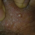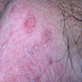 2、亚急性阴囊湿疹:阴囊皮肤轻度变厚和糜烂,渗液少,伴少许结痂或鳞屑。< |