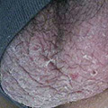 3、慢性阴囊湿疹:皮肤增厚粗糙,呈暗红或灰褐色,皱褶肥大,有鳞屑附着。< |